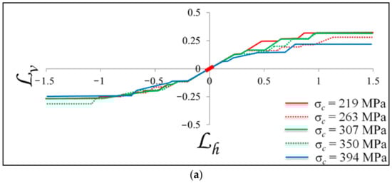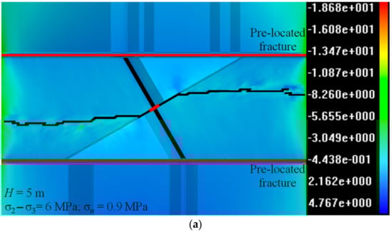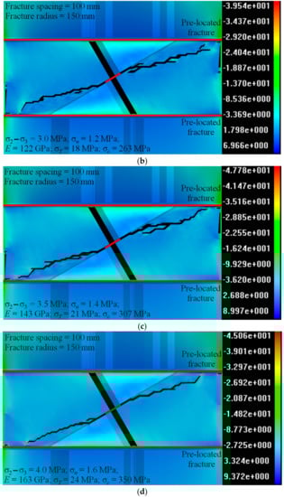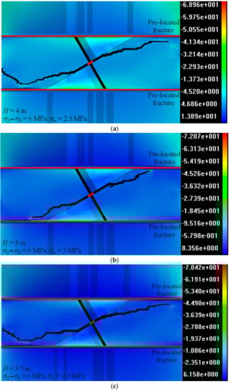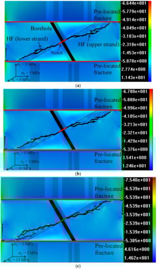 In field applications, the induced stress shadow effect of the pre-located fracture might be weakened by the non-uniform distribution of the proppant; the potential screen out; and the interaction between the HF and the NF network []. These phenomena decrease the amount of proppant injected into the HF and weaken the induced stress shadow effect [,]. Hence three scenarios are studied in which the net pressure magnitude changes from 1 MPa to 2 MPa with an interval of 0.5 MPa to consider PHF propagation with different proppant efficiency. The net pressure magnitudes are in a reasonable range since the stress change monitoring performed by Mills et al. [] at Northparkes Mines showed the induced stress change observed 14 to 48 meters above a single HF was from 0.5 MPa to 1.4 MPa.