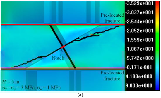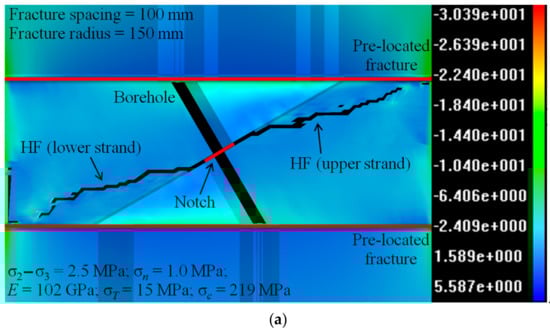 In Set 7, which is based on the E26 orebody characteristics (Table 11), the feasibility of prescribed hydraulic fracturing in the E26 orebody is studied. The differential stress between the in-situ σ2 and the in-situ σ3 in the E26 orebody is 3 MPa, which may favour HF re-orientation against its preferred direction. In Cases 7-1 to 7-3, the pre-located fractures have radii of 7.5 m with spacings of 5 m. The fracture radius is less than that in current cave mining hydraulic fracturing, which may reach 30 m. As discussed in He et al. [], the main function of the pre-located fracture in prescribed hydraulic fracturing is its influence on the local stress change, specifically, on the stress shadow.