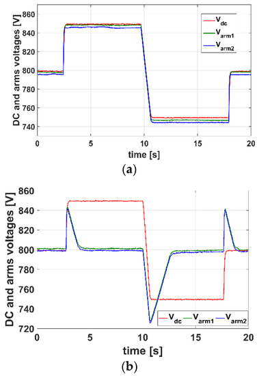Hence the DC voltage is not decoupled from capacitor voltages. If a short time brake occurs in the DC bus, this will directly affect the capacitor voltages. In Figure 13b,c, the energy control is enabled. In Figure 13b, the total arm voltages are controlled at 800 V and the DC voltage steps successively from 800 V to 850 V, from 850 V to 750 V and from 750 V to 800 V. After a short transient phase, the total arm voltages remain at their reference value. In Figure 13c, the DC voltage is held at 800 V and the total arm voltages are set to step successively from 800 V to 850 V, from 850 V to 750 V and from 750 V to 800 V. The energy control allows a decoupling between capacitor voltages and the DC bus voltage. The dynamics of the total arm voltage control loop has been intentionally reduced to avoid overvoltage on the capacitors.