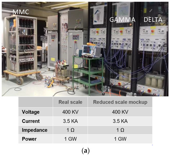The MMC has been implemented in a reduced-scale laboratory setup to test system-level control algorithms. Figure 14 shows the MTDC mock-up previously developed and described in [1]. The laboratory set-up presented in Figure 14b simulates the following imaginary situation: Three converters, namely VSCDELTA, VSCGAMMA, and the MMC, simulate an MTDC connection between three different AC grids. This could be the case as an example of the connection between Italy, Sardinia, and Corsica, actually made with thyristors technology. All converters are implemented with independent controllers to test the stability of the DC grid. A non-dead band voltage control [37] has been implemented on VSCDELTA and VSCGAMMA converters while the MMC controls the power injected in the AC grid. Several tests have been performed to verify the functionalities of the MMC when connected to a MTDC transmission network. The DC lines have been (roughly) simulated with a lumped parameters π equivalent circuit.