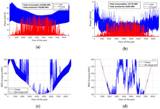 For this case study—combined with substantial PV production and BESS—the CHP plant was offline during the warm and sunny summer period. At other times, its production was scaled according to predetermined data series on the basis of the annual total production of 150 MWh and a scaling coefficient. The coefficient was determined for each hour as a sliding average of the electricity consumption of the previous 24 h.