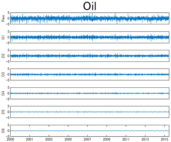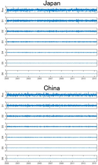Wavelet decomposition of standardized residuals for crude oil and East Asian stock markets. Raw represents the original time series. D1 (two days) and D2 (four days) represent the short-term fluctuations. D3 (eight days) and D4 (16 days) represent for the mid-term. D5 (32 days) and D6 (64 days) represent for the long term.