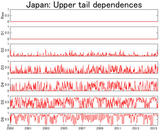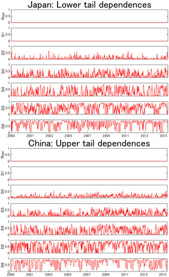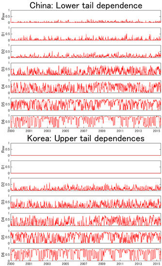 Figure 3 shows the time-varying tail dependencies by dynamic SJC copula for each of the oil-stock pair. These figures provide an intuitive impression into the time-varying tail dependence. Looking at these figures, we first find that tail dependencies varied significantly over time and differed in terms of the time horizons. The magnitude of these tail dependencies increasedas the time scales increased. Specifically, we found very weak tail dependence in the short term, which showed the absence of co-movements between crude oil and East Asian stock markets during very short time. However, the tail dependence increased as the time scales increased and differed in bear and bull markets. These results suggest that crude oil market was more likely to be tail dependent with East Asian stock markets in the mid- and long-term than in the short term. In other words, oil market would, but not simultaneously, react to the same extreme events with East Asian stock markets. The possible reasons are (1) the accurate assessment of the market impact of extreme shocks, costing investors some time, and (2) the gradual information diffusion hypothesis by [32]. These results are important in terms of hedging strategies and portfolio risk management.
