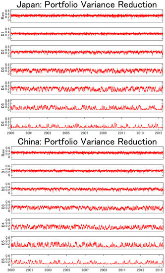 Figure 4 displays dynamic PV and ES reduction effectiveness. These plots offer graphical insights into the nature of the dynamic hedging and downside risk reduction at multiple time scales. Clearly, most values are positive over time and across frequencies, implying that crude oil is useful in reducing the risk and downside risk of East Asian stock markets over the whole sample period. The short-term hedging benefits are stable, while the mid- and long-term PV and ES reduction ratios vary dramatically over time. Moreover, the hedging benefits have been reduced in the long-run.