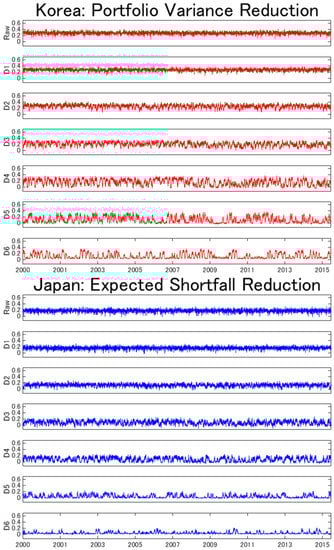 where represents the value at risk at the confidence level of a portfolio and is the conditional joint distribution. Similarly, we evaluated downside risk gains by evaluating percentage ES reduction of oil-stock portfolio with respect to stock only portfolio at different time scales in terms of the risk reduction (RR) effectiveness ratio as follows: