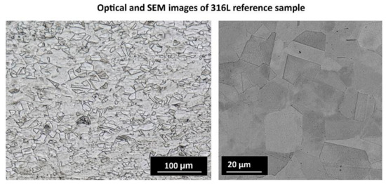 Digital and scanning electron microscope (SEM) images of the reference sample showing equiaxed austenitic grains as well as the SLM-produced structure revealing the characteristic morphology of laser-melted techniques.