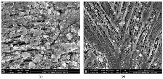As can be seen in Figure 6, the latter areas exhibit porous structures in the case of the activator-treated TNM-B1 (Figure 6a,c), whereas the corresponding regions of the reference specimen are characterized solely by very rough surfaces (Figure 6b,d).