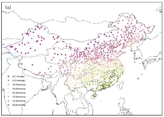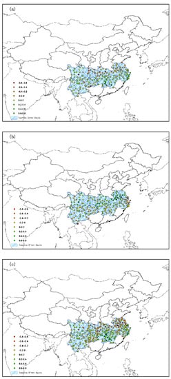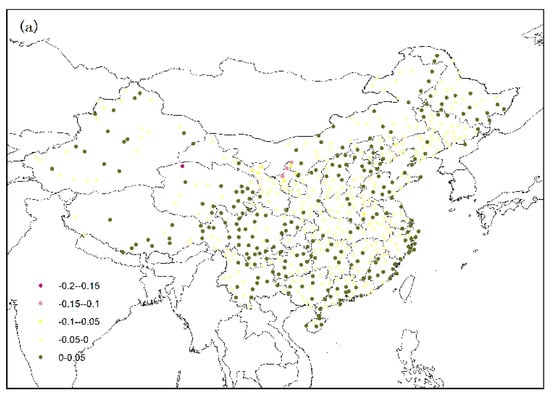 Mann–Kendall test was used to analyze the trend of extreme precipitation based on daily precipitation data recorded in China over 16 years. From 2000 to 2015, the extreme precipitation days tended to increase in Northeast China, North China, the northeastern part of Southwest China, the western part of South China, and most of East China (the green dots in Figure 3b indicate increases in extreme precipitation). There were obvious increasing extreme precipitation trends in most of the Northeast China, and the central part of East China, the most obvious of which was recorded at Ziyang Meteorological Station in Sichuan Province. The extreme precipitation tended to increase at 51.7% of the stations, indicating an increasing trend in most parts of the country due to global warming.