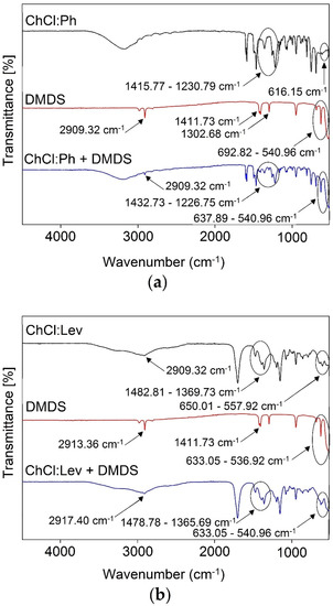 The experimental research on the mechanism of the absorption process was performed by FT-IR analysis. The spectra of pure DESs were compared with pure DMDS, and DES-DMDS complex spectra (Figure 3a–c). All characteristic bands that can be attributed to DMDS (2909.32 cm−1—δs (CH) stretch, 1411.73 cm−1—δas (CH3) def., 1302.68 cm−1—δs (CH3) def., 692.82 cm−1—C-S stretch, 540.96 cm−1—S-S stretch) are visible in the ChCl:Ph-DMDS spectrum [56], which indicates the creation of the DES-DMDS complex (Figure 3a). Theoretically, in the absorptive DMDS removal process, both sulfur atoms can act as a donor in S–H···π and as an acceptor in O–H···S and C–H···S interactions [57,58,59]. However, on the FT-IR spectra, there are no shifts corresponding to this type of interaction. Therefore, other interactions must play a key role in the DMDS absorption process. Similar results were also obtained for ChCl:Lev (Figure 3b) and ChCl:EG (Figure 3c).