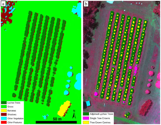(a) False colour (NIR, Red, Green) orthomosaic; and (b) corresponding CHM of lychee trees pre-pruning, including the GEOBIA delineation result (yellow outlines).