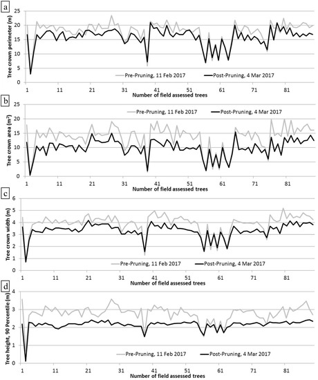 The mapping of tree structural parameters before and after pruning enabled an assessment of the impact of the pruning effects. A significant decrease in the average value of the tree structural parameters was observed for the 189 trees within the orchard between pre- and post-pruning. Decreases in the tree crown perimeter (1.94 m; 10.9%), area (3.49 m2; 25.9%), width (0.567 m; 14.7%), 90th percentile tree crown height (0.616 m; 22.3%) and PPC (14.8%) were established (Figure 11 and Figure 12). According to [12], the recommended thinning size of a lychee tree is between 15% and 25% from its initial size. Hence, the pruning results based on all 189 mapped trees showed good agreement with the recommendation. In most cases (179 out of 189 trees), a decrease was observed in the tree structural measurements for the individual tree crowns. However, some of the smaller and newly planted lychee trees (10 out of 189 trees) were not pruned, and hence the structural measurements stayed the same or slightly increased (Figure 12).