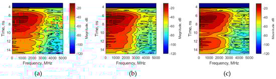 This grading-dependent behaviour of sound ballast subject to high-frequency EM fields is in agreement with subject-related literature. In fact, this had been already observed in previous research [12,20,21], where the occurrence was related with scattering and resonance effects triggered by the specific dimension of the aggregates and the air voids. The time-frequency analysis carried out using the STFT approach, as depicted in Figure 9, demonstrates that most of the energy for sound ballast (a) is focused at a short arrival time (4–6 ns). This is followed by a gradual attenuation that ends up around 14 ns. As the fragmentation of the ballast increases, a faster attenuation of the signal is observed. In particular, energy drops at 13 ns and 12.5 ns are observed for semi-crushed and totally-crushed configurations (Figure 9b,c).