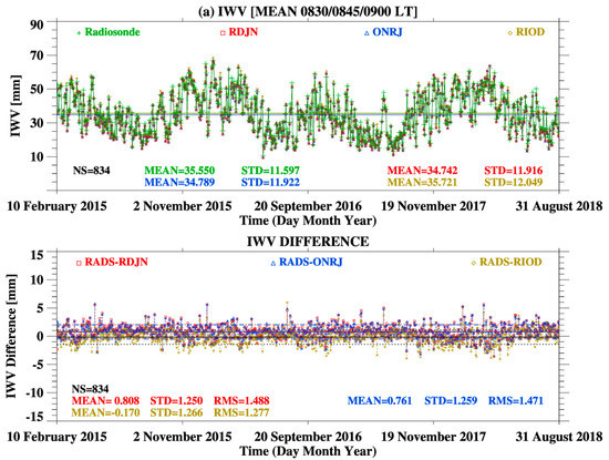 The comparisons of GNSS-IWV with the twice-daily radiosonde-IWV (RADS 09:00 LT and 21:00 LT) are used to evaluate the performances of IWV estimates for RDJN, ONRJ, and RIOD. Despite the disadvantage of the non-instantaneous measurements of the radiosonde observations, since the soundings are launched about 30 min before the standard time (ST), and the soundings last from 1–2 h [58], we first tested the mean differences between GNSS-IWV at the ST of the radiosonde launching (i) and four different scenarios—(ii) 30 min before ST, (iii) 15 min before ST, (iv) 15 min after ST, and (v) 30 min after ST (Table 4). The mean differences between IWV at ST and those scenarios were quite small, with low percentage of the differences, and high correlation coefficient—nearly unbiased especially in the stations RDJN/ONRJ. The amplitudes of the differences between the scenarios for morning soundings were equal or lesser than 0.031 mm, and STD/RMS decayed from 0.641/0.784 (ii) to 0.394/0.502 (iii) and increased symmetrically from (iv) and (v) matches. The differences for the nocturnal soundings had amplitudes equal or lesser than 0.251 mm, with similar decaying compared with that in 09:00 LT, but they increased up to 1.140/1.607 mm in the matches (iv) and (v).
