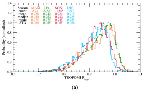Figure 15a presents the seasonal distribution of TROPOMI DCCs for data collected over the period of a year with probability density functions (PDFs). Even though the number of DCCs is not sufficient to calculate a representative PDF for the observations, the PDFs have similar distribution patterns regardless of the number of DCCs in each season. However, given that distribution modes are generally used to monitor the calibration accuracy of meteorological sensors, the PDF modes are too variable since the bidirectional reflectivity of the DCCs and the disparity in the cloud optical properties have not been sufficiently accounted for so far. However, the temporal variability caused by these uncertainties could cancel each other out as the reflectivity ratio between two different wavelengths represents in Figure 15b. The ratio of DCC reflectivity at 354 and 397 nm is used because reflectivity at 397 nm (Ca II H line) is affected both by scattered and directly transmitted light. Even with the highly expected variability, the ratio of the mean reflectivity at both wavelengths appears relatively stable within 0.99–1.01.