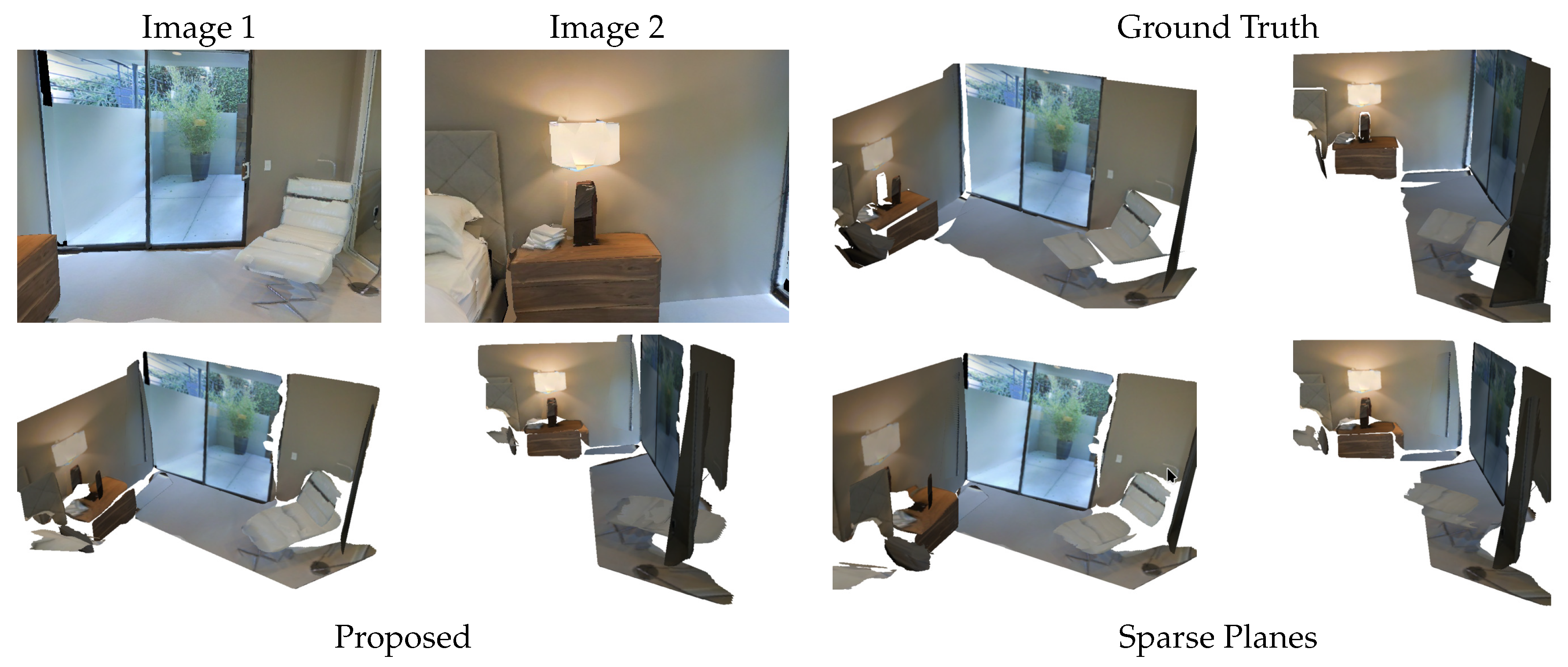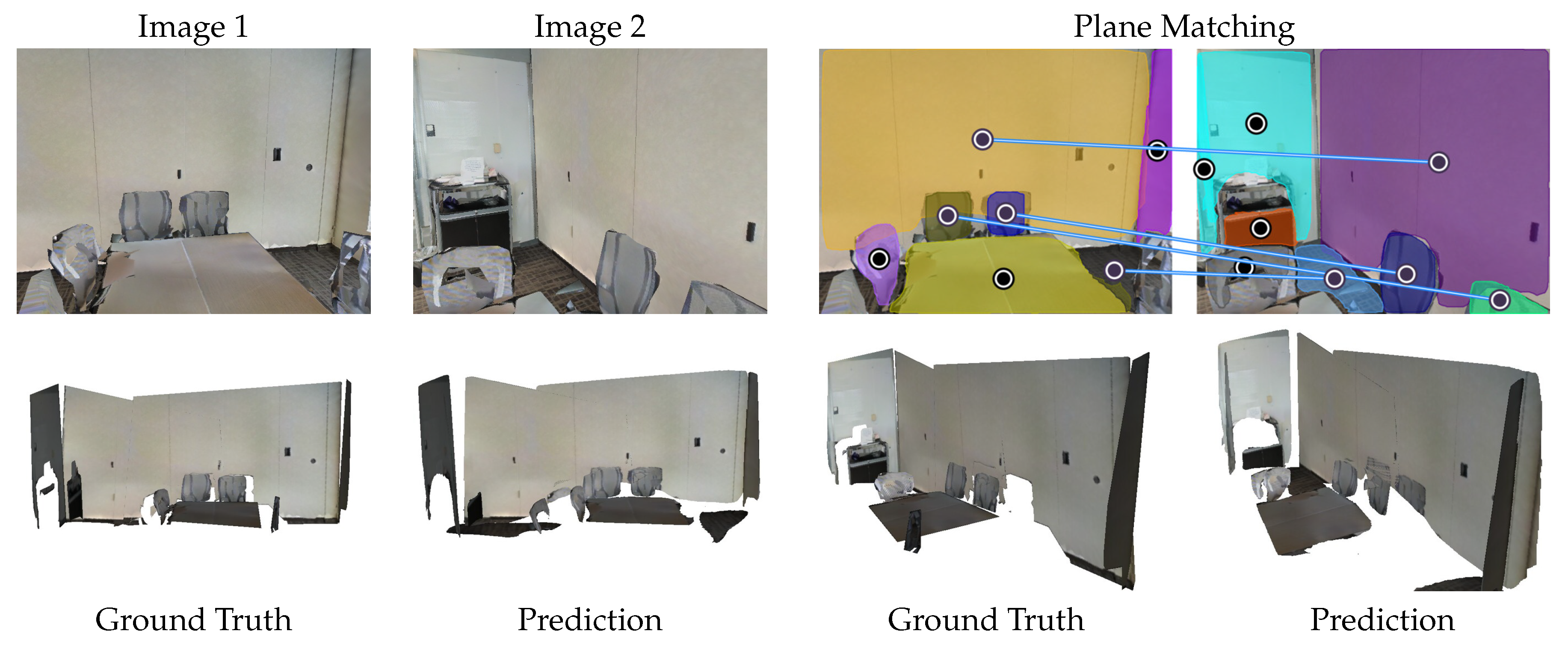 - Agarwala, S.; Jin, L.; Rockwell, C.; Fouhey, D.F. Planeformers: From sparse view planes to 3d reconstruction. In Proceedings of the European Conference on Computer Vision, Tel Aviv, Israel, 23–27 October 2022; Springer: Berlin/Heidelberg, Germany, 2022; pp. 192–209. [Google Scholar]