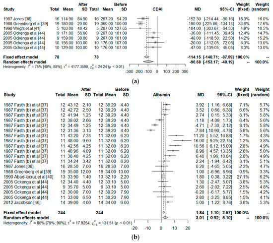To calculate the effect size of the enteral nutrition on the variables, Crohn’s Disease Activity Index (CDAI), albumin, postoperative complications (COM), and body weight (BW), a meta-analysis was performed. For this, the model of fixed effects and the model of random effects were utilized. The results were presented as a forest-plot, along with the percent Heterogeneity and its confidence interval at 95%, the T-value, and the heterogeneity test.
