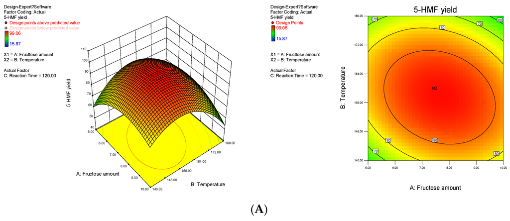 Response fitted surface area and contour plot for 5-HMF yield based on (A) temperature and fructose loading; (B) reaction time and temperature and (C) fructose loading and reaction time.