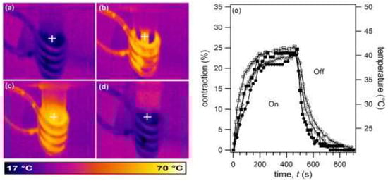 As seen in the previous section, the addition of nanomaterials does not alter the thermo-mechanical behavior, preserving the ability of the LCE-based composites to act as shape-memory actuators subject to temperature variations. However, in some cases, the nanostructured dopants induce new properties, such as the magneto-mechanical response of LCE-composite films prepared with iron-oxide nanoparticles [,,,]. Kaiser et al. [] reported a reversible magnetic-field-induced shape change in LCE-doped systems under on/off cycles of various electromagnetic-field amplitudes (from 8.5 to 42.6 kA/m), reaching a contraction of the starting composite films comparable to the thermally induced contraction. Herrera-Posada et al. [] confirmed the potential of LCEs doped with 0.5 and 0.7 wt% oleic-acid-coated iron-oxide nanoparticles as magneto-active elastomers. In Figure 13a–d, the temperature evolution of the magnetic elastomers determined from thermal infrared images is reported, while the superposition of the instant temperature of the magneto-active elastomers during actuation, and the contraction percentage profiles are shown in Figure 13e. The application of an alternating field of 48.24 kA/m and an oscillating frequency of 298 kHz causes relaxation and hysteresis phenomena in the magnetic nanoparticles, leading to energy dissipation or heat loss []. This mechanism is at the origin of the thermally driven isotropic–nematic transition from the heat generated by the magnetic nanoparticles.