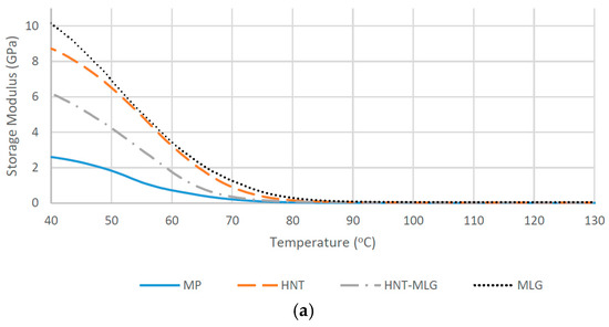 In this research, the addition of 0.1 wt % of HNT and MLG increased the Tg as shown in Figure 3. An increase in Tg with HNT and MLG shows that the fillers were uniformly dispersed [12,29]. As for HNT, the change in Tg associated with inorganic fillers was reported and proposed by others [37]. The two common factors were rigid phase reinforcement and destroying the epoxy-based polymer network structure [38]. Other authors also proposed that HNT and other clay particles restrict the mobility of polymer chains [39,40]. In case of MLG, when it is uniformly dispersed, the wrinkled texture and high surface area influence the maximum exothermic heat flow temperature by restricting polymer chain mobility, thereby causing an increase in Tg [30].