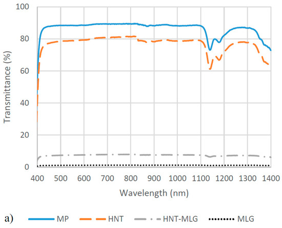The optical transmittance of the nanocomposites was investigated. In Figure 6a,b, it can be observed that MP is essentially highly transparent over the 400–1400 nm wavelength. The average transmittance value of MP is 72.9%. At 0.1 wt % HNT, it recorded 57.6% average value. The 0.05 wt % HNT-0.05 wt % MLG-reinforced polyester recorded only 4.3% optical transmittance. The 0.1 wt % MLG had an optical transmittance of 0.29%. It can be seen, even at 0.05 wt % HNT-0.05 wt % MLG, the optical transmittance dropped significantly. After water exposure, a similar trend was observed where monolithic polyester had the highest optical transmittance. However, the water exposure significantly reduced the optical transmittance for monolithic polyester (decrease of 46.3% compared to dry condition). The 0.1 wt % HNT-reinforced polyester lost 37% of optical transmittance due to water absorption. The optical transmittance for 0.05 wt % HNT-0.05 wt % MLG-reinforced polyester and 0.1 wt % MLG-reinforced polyester were also found to be decreased, but the values were not significant.