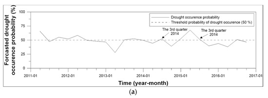 Figure 12 shows the drought forecast results for the verification period from 2011 to 2016, as a result of the probability that the SII for the next quarter will be less than or equal to zero, that is, the drought occurrence probability. In the third quarters of 2014 and 2015 (Figure 12a), the probabilities of drought occurrence in the Soyanggang dam exceeded 50%, and in reality, extreme droughts occurred with an SII value of −2 or less. These results mean that drought forecasts were reliable for the two quarters if the threshold probability of drought occurrence was set at 50%. In the case of the Andong dam, however, in the third quarter of 2013 (Figure 12b), when a moderate drought with an SII of −1.2 occurred in reality, the probability of a drought occurrence was calculated to be below 50%. It is believed that this result occurred due to the large correlation coefficient of inflows between the second and third quarter SIIs. Specifically, the SII of the Andong dam in the second quarter of 2013 was larger than zero in reality. Because of this, the non-exceedance probability that the SII is less than or equal to zero in the third quarter was forecasted to be small, since the SII in the third quarter has a large correlation coefficient with the SII in the second quarter. Unlike 2013, the probability of a drought occurrence in the third quarter of 2015 was forecasted to be high because the second quarter SII was small. This means that the drought forecasting method has limitations in forecasting moderate droughts that randomly occur without relation to the prior quarter’s SII at reservoirs with a large correlation coefficient for the SIIs of successive quarters. On the other hand, it was successful to forecast extreme droughts that occur after some continued droughts.