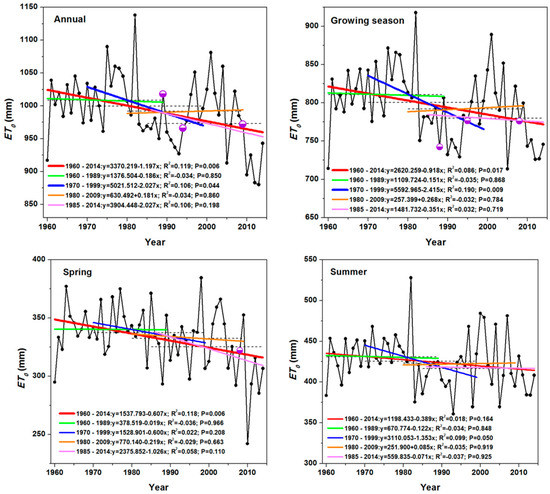 The results of the break trend analysis for the area-averaged annual, seasonal, and the growing season ET0 time series of the 21 stations during 1960–2014 are shown in Figure 3, and those of the MK test and Sen’s slope estimator are summarized in Figure 4. Figure 3 indicates an evident decreasing trend in ET0 in the annual, seasonal, and growing season time series, especially for the annual, growing season, and spring periods, which passed the significance test at the 0.05 level. In addition, it was shown that almost all annual, seasonal, and the growing season time series had experienced a decreasing trend of ET0 for the four climatological normal time ranges with the rate ranging from −2.415 to −0.003 mm/a. The sharpest drop rate was detected from 1970 and 1999, and the maximum was in the growing season (−2.415 mm/a). However, it is noteworthy that the region experienced an increasing trend of ET0 in the annual, seasonal, and the growing season time series during 1980–2009, with a rate ranging from 0.085 to 0.296 mm/a, except in spring and winter, although the increasing trend was not significant. To detect the change points, the MK test was performed in the ET0 for the annual, seasonal, and the growing season time series during 1960–2014. As shown in Figure 3, both the annual and growing season series have three change points, 1989, 1994, and 2009, and 1989, 1995, and 2008, respectively. Seasonally, in spring, there was a clear change point in 2008; in autumn, four change points were identified, 1972, 1985, 1994, and 2009; in winter, the series had change points at 1977 and 2011. However, there was no detectable change point in summer. The results show that abrupt changes in the ET0 series mainly occurred in the early and mid-1990s, leading to a fluctuation of ET0 which is dominated by a decreasing trend.
