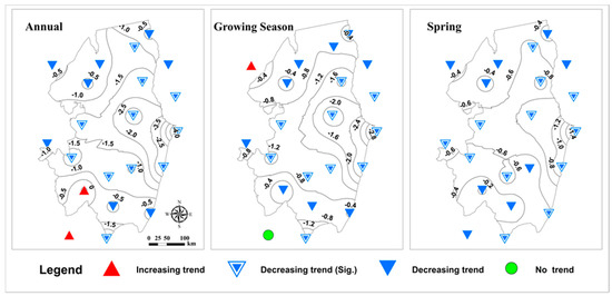 The spatial variations of ET0 trends at different time scales from 1960 to 2014 based on the MK test are displayed in Figure 5. All considered time scales indicated a similar pattern, with the majority of the time series of ET0 indicating a downward trend in the entire region, except during autumn. The greatest number of stations with significant decreasing trends of ET0 were distributed in the eastern, northeastern, and central regions and frequently occurred in the annual, spring, and growing season periods. These regions also had the highest rate decrease in ET0, ranging from −0.2 to −4.0 mm/a. However, positive changes were recorded in the southwestern and southern regions in autumn and winter, but they were statistically insignificant, with rate increases ranging from 0.01 to 0.40 mm/a. Overall, the spatial pattern of ET0 change in the Songnen Grassland is that of a significant downward trend across the central region with a gradually reduced intensity from the eastern parts to the western areas.
