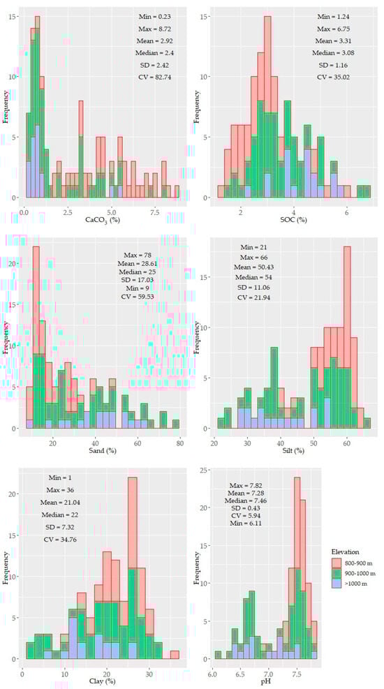 Histograms and descriptive statistics of the tested soil properties (n = 114). The values of the soil properties were color coded in accordance with three elevation levels: 800–900, 900–1000, >1000 m.