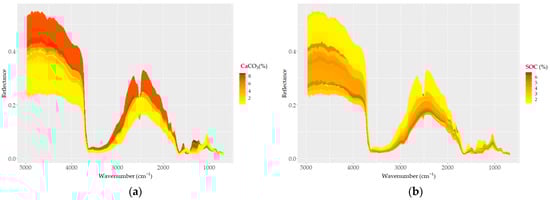 Based on the effect of CaCO3 on their reflectance, the soil spectra can be divided into two groups: (i) carbonated (CaCO3 > 2%) and (ii) non (low)-carbonated soils (CaCO3 < 2%). High reflectance and a strong absorption band centered around 2520 cm−1 were typical for the carbonated soils. The non-carbonated soils were characterized by an inverse spectral behavior, low reflectance, and a lack of the absorption band centered at 2520 cm−1 (Figure 4g). The absorption depth increased distinctively with increasing amounts of CaCO3 at 2520 cm−1; overall, the absorption feature covered a region from ~2400 to ~2600 cm−1. Apart from the two differentiated main spectral features, the carbonated soils appeared with absorption bands evident at 1500 and 1100 cm−1, which were not present in the non (low)-carbonated soils. Based on the heterogeneity of the structure of soil organic matter, four groups of SOC spectra showed apparent variability; the spectra of soils with high SOC contents were low in reflectance across the whole wavelength range, and samples containing lower SOC contents showed stronger reflectance intensity values (Figure 4b–h).