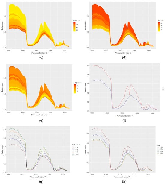 The effect of the sand content on soil reflectance was also evident in its relations to SOC and CaCO3. As sand was positively and negatively correlated with SOC and CaCO3, respectively, the spectra of high-sand-content samples showed low reflectance (Figure 4c). The effect of clay and silt contents on the soil reflectance was similar to that of CaCO3: the higher the clay and silt contents, the higher the reflectance (Figure 4d,e). Both the color-coded and averaged spectra allowed for the discrimination of the spectral features associated with clay minerals between 3700 and 3600 cm−1 and 2000 and 1790 cm−1, as well as the discrimination of the spectral features associated with silicates between 1280 and 1070 cm−1 (mostly quartz; Si–O and silicate, respectively). Furthermore, the absorption bands of organic matter were also evident (aliphatic C–H elongating bands at 2960 cm−1 and 2870 cm−1; amide I and II bands in the region between 1640 and 1400 cm−1).