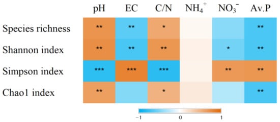Spearman’s correlation coefficient between diversity indices and soil chemical properties (n = 15). The colour indicates the value of correlation coefficient (−1 < r < 1). *, **, and *** indicate significant correlation at p < 0.05, p < 0.01, p < 0.001.
