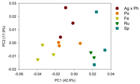 Microbial community analysed by principal coordinate analysis of Unifrac distances. Ag × Ph, A. alba × P. pratense; Po, P. pratensis; Fe, F. ovina; Ru, R. acetosella; Sm × Ss, S. miyabei × S. salicifolia.