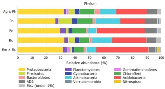 Relative abundance of soil bacteria at the phylum level in the pasture. Ag × Ph, A. alba × P. pratense; Po, P. pratensis; Fe, F. ovina; Ru, R. acetosella; Sm × Ss, S. miyabei × S. salicifolia.
