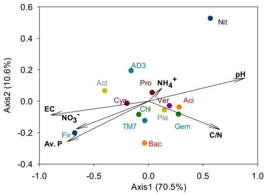 As there are no obvious trends in the effects of plant communities, bacterial diversity seemed to be more influenced by soil chemical properties. Soil pH is supposed to influence nutrient availability for microbes and it is positively correlated with bacterial diversity in many cases [,]. Diversity indices were more strongly correlated with available P than N nutrients, which is in accordance with a previous study []. The correlation analysis showed that NO3− was more closely correlated with the major bacterial groups than NH4+. Zhang et al. [] also obtained the same results in an investigation during succession on an abandoned farmland.