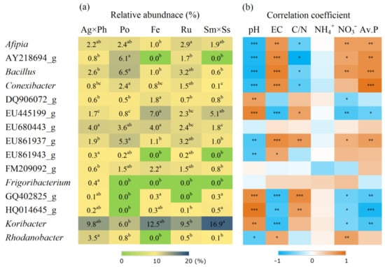 Relative abundance of 15 major bacterial genera showed significant difference and its correlation with soil chemical properties. (a) Relative abundance of bacteria; (b) Spearman’s correlation coefficient. Ag × Ph, A. alba × P. pratense; Po, P. pratensis; Fe, F. ovina; Ru, R. acetosella; Sm × Ss, S. miyabei × S. salicifolia. Different letters in the same row indicate significant differences according to Tukey test (n = 3, p < 0.05). *, **, and *** indicate significant correlation at p < 0.05, p < 0.01 and p < 0.001, respectively.