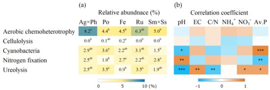 Putative functions of soil bacteria showed significant difference according to FAPROTAX and their correlation with soil chemical properties. (a) Relative abundance of bacteria; (b) Spearman’s correlation coefficient. Ag × Ph, A. alba × P. pratense; Po, P. pratensis; Fe, F. ovina; Ru, R. acetosella; Sm × Ss, S. miyabei × S. salicifolia. Different letters in the same row indicate significant differences according to Tukey test (n = 3, p < 0.05). *, **, and *** indicate significant correlation at p < 0.05, p < 0.01 and p < 0.001, respectively.