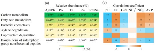 Putative functions of soil bacteria showed significant difference according to KEGG pathway and their correlation with soil chemical properties. (a) Relative abundance of bacteria; (b) Spearman’s correlation coefficient. Ag × Ph, A. alba × P. pratense; Po, P. pratensis; Fe, F. ovina; Ru, R. acetosella; Sm × Ss, S. miyabei × S. salicifolia. Different letters in the same row indicate significant differences according to Tukey test (n = 3, p < 0.05). * and ** indicate significant correlation at p < 0.05 and p < 0.01, respectively.