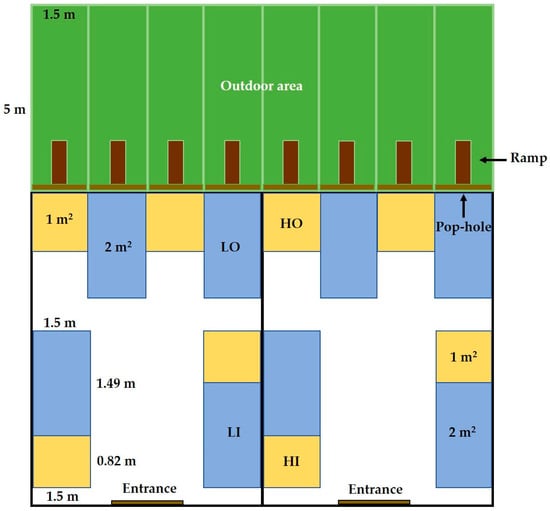 Experimental poultry facilities. Dimensions of pens include the supplementary space added to compensate for the area occupied by feeder and drinker. LO = Low stocking density with outdoor access; HO = High stocking density with outdoor access; LI = Low stocking density indoors; HI = High stocking density indoors.