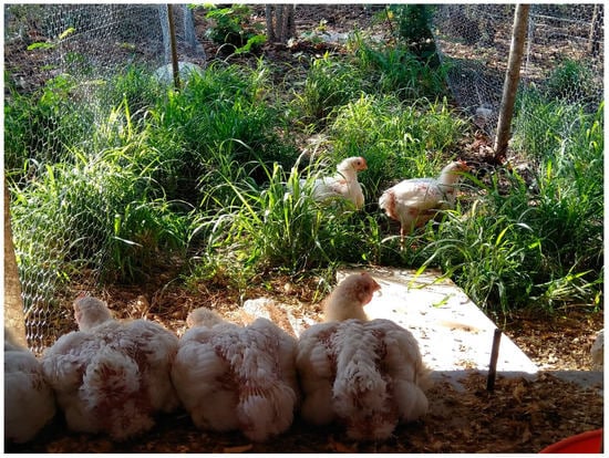 There is growing demand for poultry meat worldwide, particularly in developing countries partly in response to population growth and growing affluence []. In response, poultry industries have intensified, adopting high stocking densities and rapid growth genetics to maximise output and profitability. Crowded living space can have a significant positive impact on farmer incomes, which generally increase with stocking density []. However, decrease in space allowance is likely to have detrimental effects on the welfare of the birds [,,]. Given that the microclimate for chickens in most tropical conditions accords with their evolutionary environment, outdoor access could potentially improve their welfare without greatly increasing costs but it is still necessary to develop standards that ensure the outdoor area is properly functioning as a form of enrichment for the birds []. In particular, the possibility of predation, sporadic feed availability and transmission of diseases from wildlife must be recognised, but on the positive side, it could provide a valuable source of nutrients for poultry, especially since tropical ecosystems have a vast natural potential for production of forage plants.