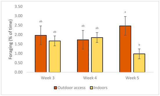 LS Means of the effects of system × week on foraging of commercial-line broilers. Different superscript letters indicate statistically significant differences (Tukey’s HSD test; p ≤ 0.05).