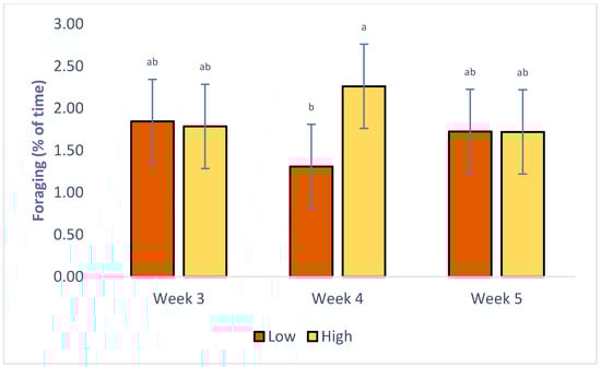 LS Means of the effects of density × week on foraging of commercial-line broilers. Different superscript letters indicate statistically significant differences (Tukey’s HSD test; p ≤ 0.05).