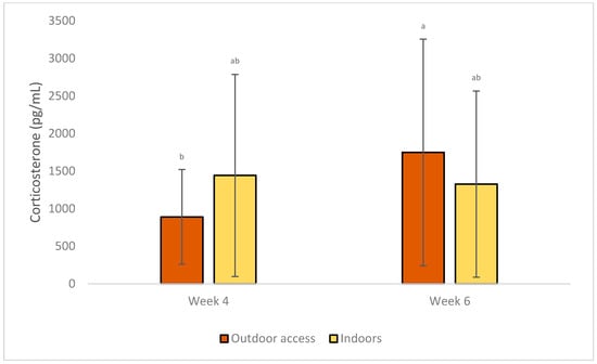 Serum corticosterone levels were increased in week 6 compared with week 4 of age, as seen in Table 5, but only when outdoor access was provided (1748.8 ± 1508.8 vs. 891.1 ± 630.1; p = 0.01), as seen in Figure 5. It was also increased for birds at low density on week 6 (1786.6 ± 1428.9), compared to week 4 (1163.2 ± 1048.1) (p = 0.02), as seen in Figure 6.