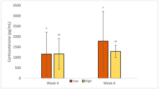 LS Means of the effects of density × week on corticosterone concentration of commercial-line broilers. Different superscript letters indicate statistically significant differences (Tukey’s HSD test; p ≤ 0.05).