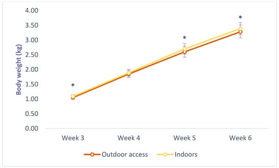 Effects of outdoor access on body weight of commercial-line broilers. * Indicates statistically significant differences (Tukey’s HSD test; p ≤ 0.05).