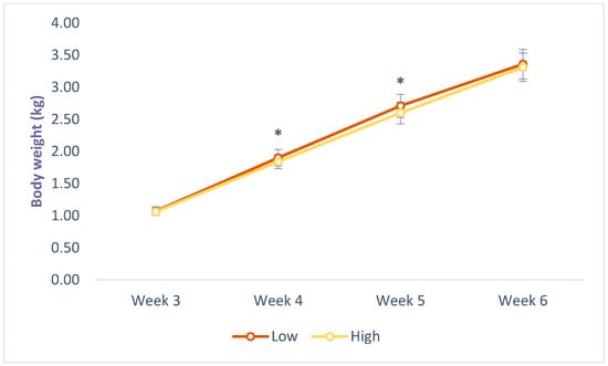 Effects of stocking density on body weight of commercial-line broilers. * Indicates statistically significant differences (Tukey’s HSD test; p ≤ 0.05).