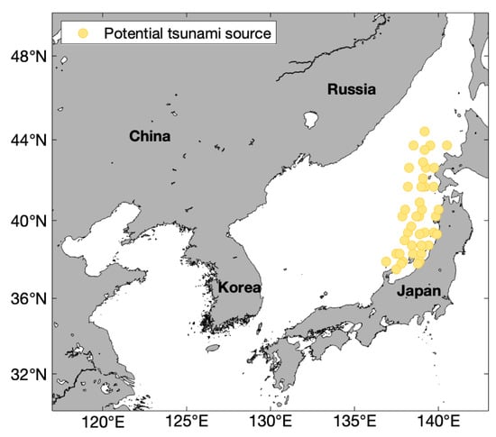 The location of 39 potential tsunami sources near the west coast of Japan.
