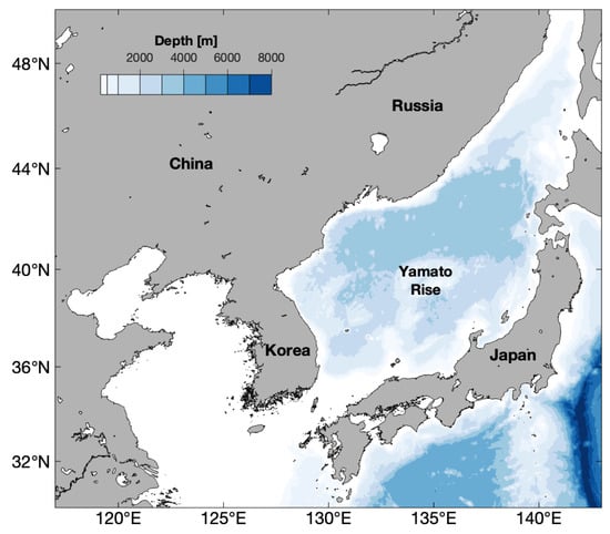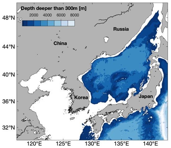 Colored map of areas where water depth is greater than 300 m in the eastern sear of Korea and Japan.