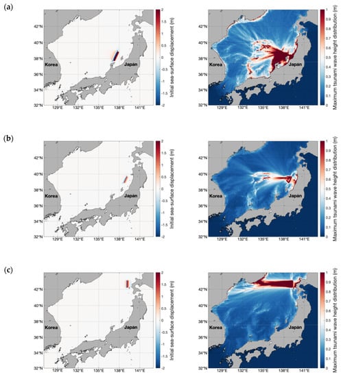 Representative results of numerical modeling with potential tsunami scenarios in Table A1 (Appendix A): (a) Case 04: left—initial sea surface displacement (m), right—maximum wave height distribution (m); (b) Case 10: left—initial sea surface displacement (m), right—maximum wave height distribution (m); (c) Case 30: left—initial sea surface displacement (m), right—maximum wave height distribution (m) [].