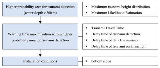 Flow chart (blue box) and considerations (white box) used for determining an optical deployment region for offshore tsunami observation instruments.