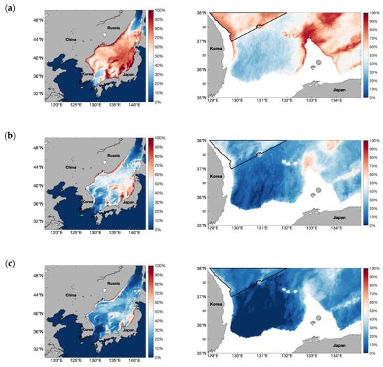 MLE results for maximum tsunami wave height distribution from COMCOT numerical modeling of 39 potential tsunami scenarios. Probability results for (a) 0.1 m (b) 0.2 m and (c) 0.3 m maximum height tsunami wave. The left side displays the results in the entire numerical model domain, and the right side displays the results in the eastern sea of Korea in water depth greater than 300 m. The black line indicates the higher tsunami detection probability boundary.